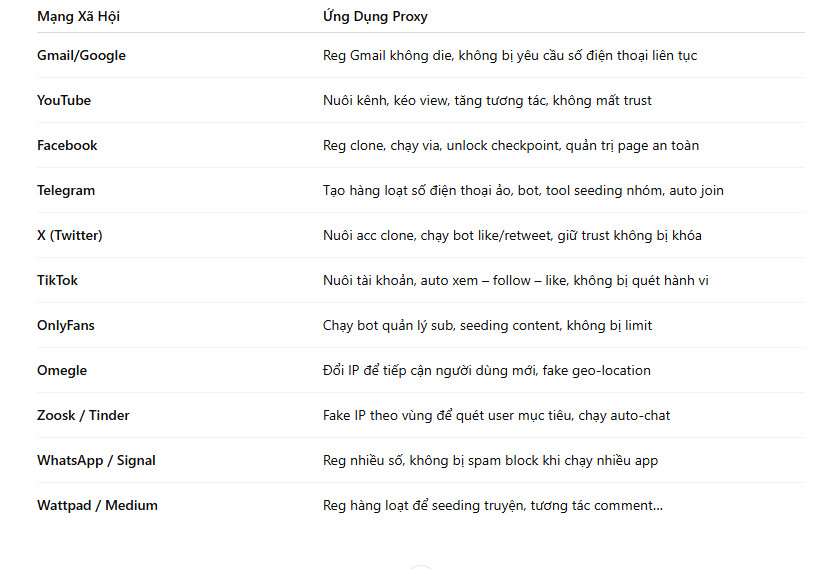 Và đây là lúc dịch vụ proxy chuyên dụng cho các nền tảng mạng xã hội như Gmail, YouTube, Facebook, X (Twitter), TikTok, Telegram, WhatsApp, OnlyFans, Omegle,… trở thành thứ không thể thiếu.