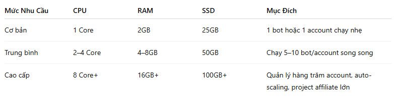 CPU đa nhân nếu chạy đa bot / chạy headless browser.