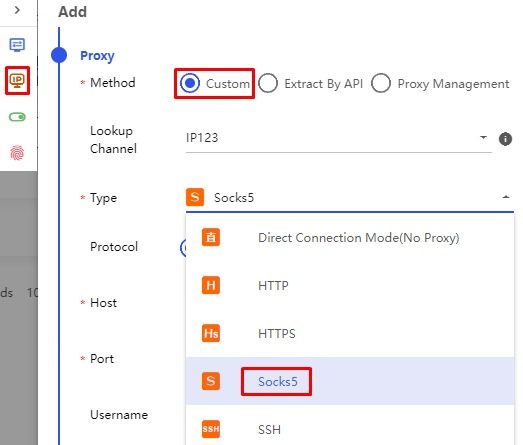 Chọn Custom → Chọn giao thức proxy (mình thường dùng SOCKS5 vì nó an toàn và ổn định hơn HTTP).
