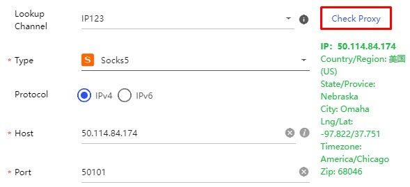 Nhấp “Check Proxy”. Nếu hiện màu xanh lá + hiển thị vị trí → thành công.