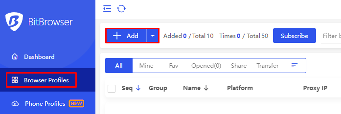 Khởi động BitBrowser, nhấp vào “Add” trong mục Browser Profiles.