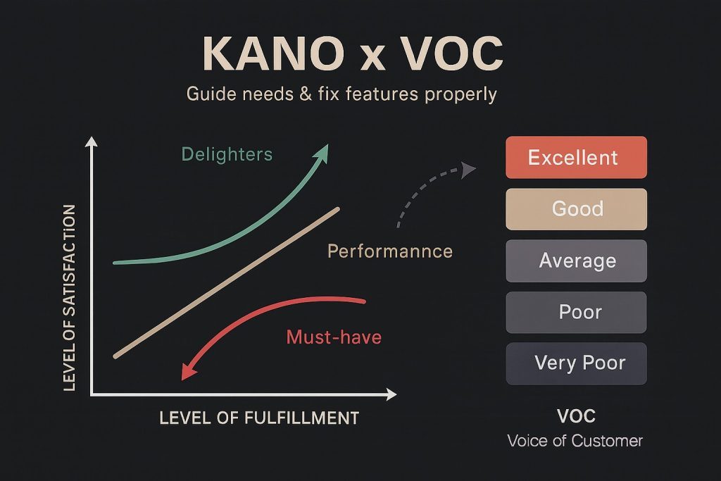 Và đây là lúc mà bộ đôi chiến lược Kano Model và Voice of Customer (VoC) xuất hiện, như vẽ ra 1 bản đồ và la bàn cho người làm sản phẩm.